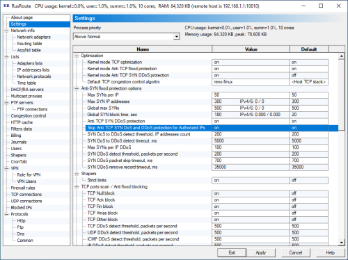 New in version: - Fixed an issue with the firewall rule generator wizard that sometimes created standard network protocols with bidirectional settings.+ Added the "Skip Anti TCP SYN DoS and DDoS protection for Authorized IPs" option to the global settings window. This option works with both kernel-mode protection (driver updated) and user-level protection. Since the driver does not contain information about firewall rules, the kernel-mode option works differently than user-level protection: the driver checks for authorized status of the source IP address of the packet. + Slightly improved display of the context menu in the Blocked IPs window. + RusRoute firewall has been tested with some DoS and DDoS stress tests.