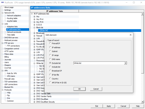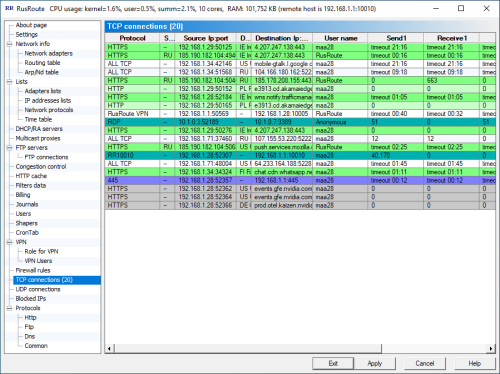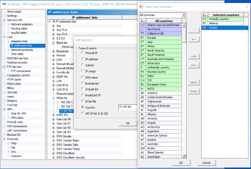 New in version: + Improved performance with internal firewall structures (searching IP address lists, etc.). + Improved performance when searching for IP addresses among subnets and IP address ranges in Roskomnadzor format files. Previously, a linear search was performed; now, a tree search is used. Address ranges are, where possible, merged during loading. + Support for GeoIP - country detection by IP, GeoIP database updates via cron tab and manually. + New elements in IP address lists: "Country" and "Exclude List" (excluding IP addresses from another list). - Fixed a rare error when processing responses from the RusRoute dynamic DNS service. + Other improvements. - Minor bugs fixed.