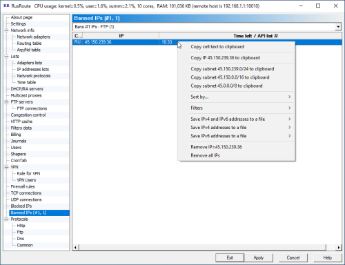 New in version: + New "Banned API IPs" page. The RusRoute firewall has long had the ability to maintain RusRoute and user-specific lists of banned IP addresses for application-level filters by accessing specific URLs. For example, after five requests to http://127.0.0.1:10000/api.cgi?api_key=KEY&cmd=IpListAddEx&n=13&ip=192.168.1.111 , IP 192.168.1.111 will be added to the 13th list of banned addresses for 15 minutes. And when accessing http://127.0.0.1:10000/api.cgi?api_key=KEY&cmd=IpListAdd&n=13&ip=192.168.1.111&to=60 , IP 192.168.1.111 will be immediately added to the 13th list of blocked addresses for 1 minute. This version additionally implements list visualization features, the ability to remove an address from the list, save the list to a file, clear the list, and more. + Minor tweaks to thread synchronization function calls, making them safer in terms of exception handling.