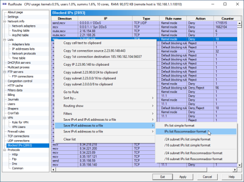 Blocked IP addresses are displayed, including those blocked by anti-DoS protection. When anti-DDoS protection is running, multiple attack addresses are collapsed into 0.0.0.0 and ::0 to reduce the amount of data processed, and into 0.0.0.1 and ::1 for anti-SYN DDoS.