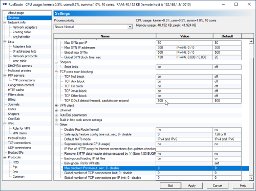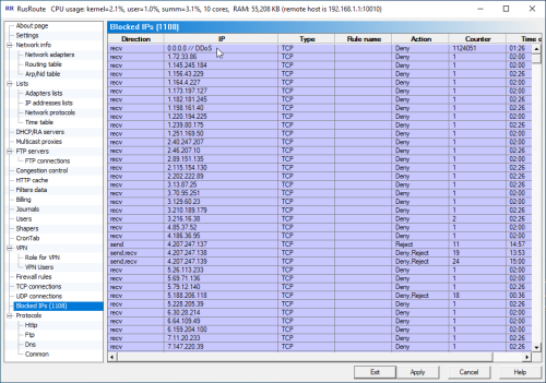 New in version: + Improved anti-DDoS protection. SYN-ACK TCP Reflect and ACK Scan/Flood stress testing has been performed. TCP DDoS attack detection has been added. + Improved the performance of the blocked IP addresses window (in the previous version, the window would freeze when there were less than 100,000 blocked IPs). Blocked IP addresses are now collapsed to 0.0.0.0 or :: // DDoS when a DDoS attack is detected. The internal limit on the maximum transferred data block size has been increased; in the case of a large data transfer in the blocked IPs window, some addresses may not be included in the list. + Added settings the TCP DDoS detect thresold and the Max. blocked IPs timeout. + Slightly accelerated handling of XML document objects, and shortened the executable code. * ACK Scan/Flood testing revealed that when internet access was provided through an Asus RT-AC68U router, internet traffic was completely blocked during the attack. When internet access was provided through a PC with a RusRoute firewall, internet access was possible during the attack at night (more than 1.6 million TCP ACK Flood packets were blocked in 60 seconds), but during the day (when the network is busier), internet access was significantly impaired (more than 1.1 million TCP ACK Flood packets were blocked in 60 seconds).